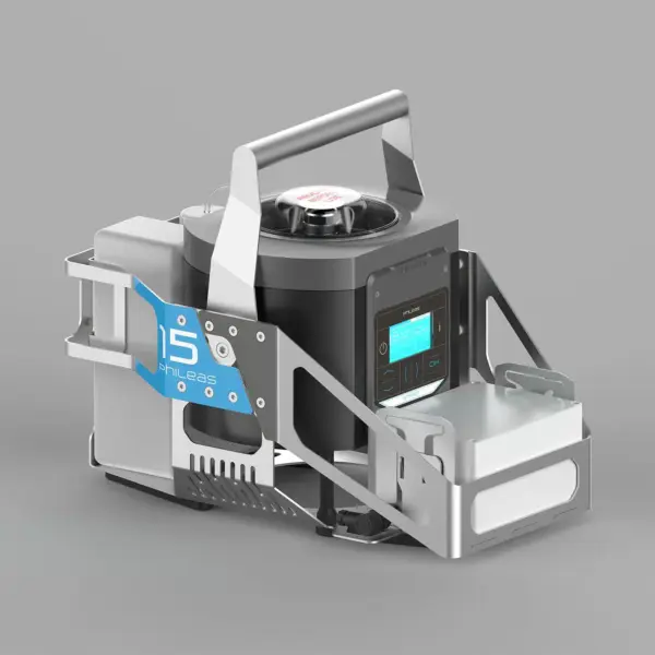 With its stable base, Phileas® 15 can be easily inserted into the structure of tanks or silos. It is especially adapted for treating high volumes of tank from 20 up to 1000 hL. It can also be used in spaces without electrical outlets (truck cabins, planes, etc.).