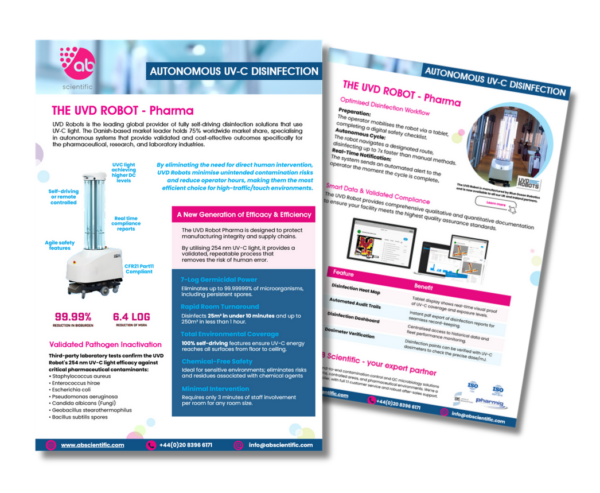 The ‘UVD Robot Pharma’ is the world’s first – and only – fully autonomous disinfection robot specifically designed for UV-C disinfection of cleanroom environments. Engineered with precision to meet the stringent GMP requirements of the pharmaceutical industry, it ensures superior UV-C light disinfection while maintaining full compliance with cleanroom standards. AB Scientific is the selected UK partner for UVD Robots within the pharmaceutical sector.